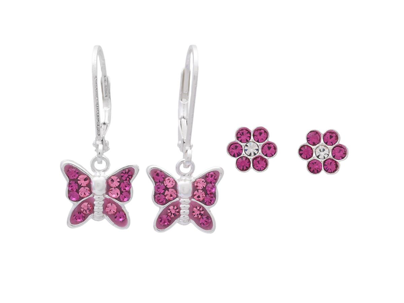 EARRINGS, 2 pair, sterling silver, cubic zirconia, flowers, butterflies, closeable hooks, pushback, weight 1,6 g.