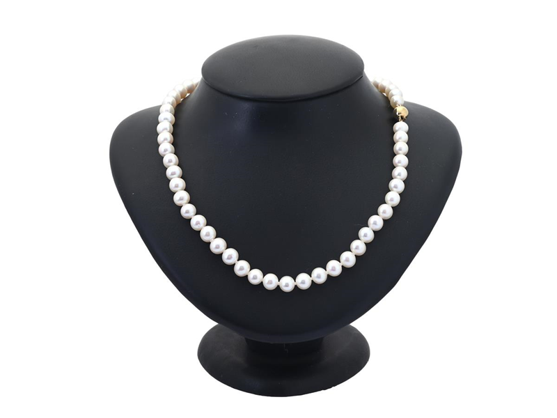 PEARL NECKLACE, cultured freshwater pearls approx. 7,5 mm, knotted, clasp 9K gold, length 45 cm.