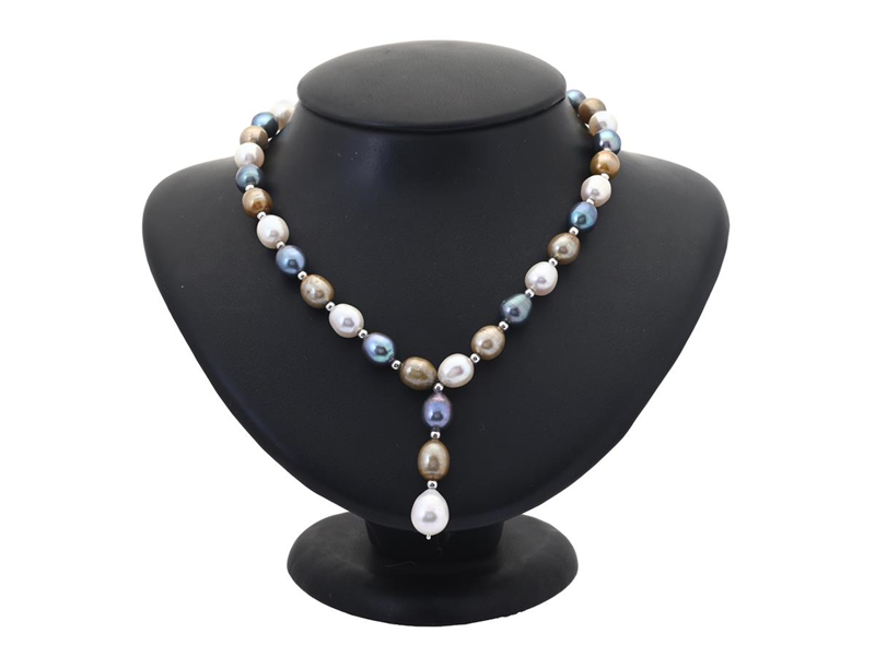 PEARL NECKLACE, cultured dyed freshwater pearls, white brown blue, silver-tone hardware, length 47 + 4 cm.