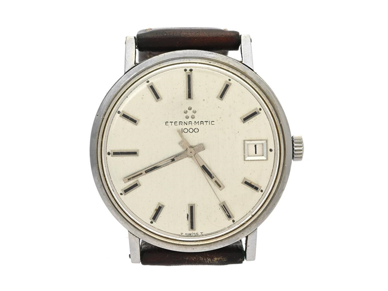 ETERNA-MATIC, 1000, Cal 1489 K, Serial no. 5374585, Case no. 5158135 / 106 FT, men´s wristwatch, 34,5 mm, steel, self winding, plastic crystal, date, damaged dial/hands, damaged case (pores), leather strap, (damaged), approx. 1965.