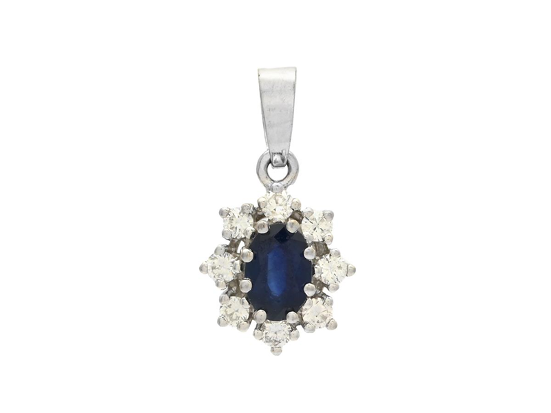 CLUSTER PENDANT, 14K white gold, sapphire, 8 brilliant cut diamonds, approx. 0,16 ctw, height 16 mm, weight 1,3 g.