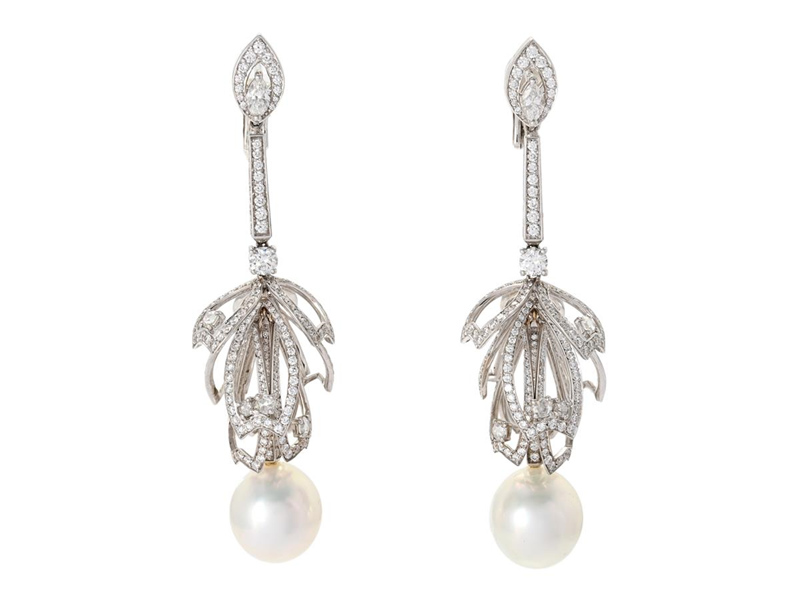 EARRINGS, 18K white gold, South sea pearls, approx. 604 pcs, brilliant cut diamond -, marquise - and rose cut diamonds approx. 4,50 ctw, approx. TW-Cr/VS-SI, height 67 mm, weight 21,4 g, pushback.