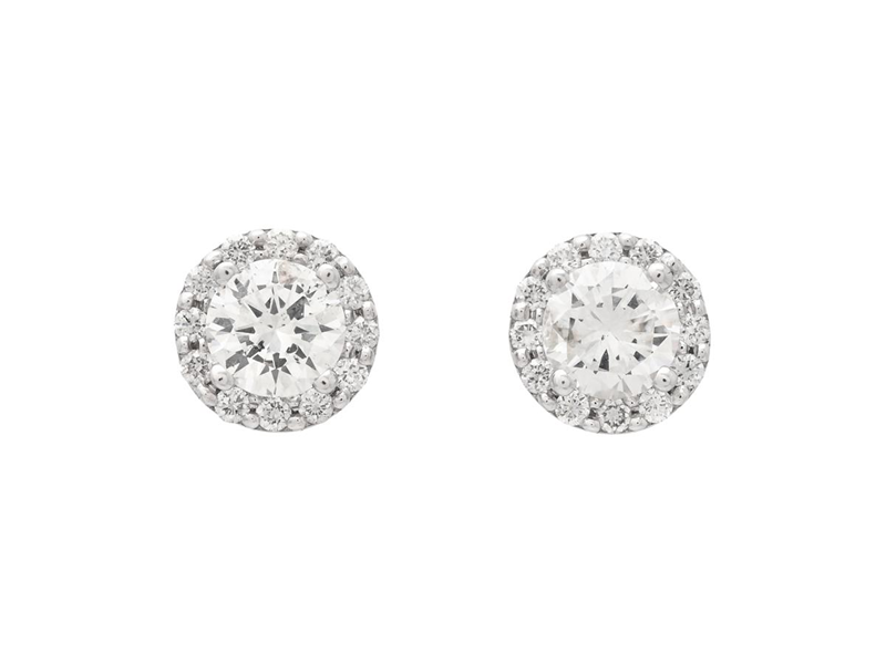 EARRINGS, 18K white gold, brilliant cut diamonds approx. 1,50 ctw, approx. TCr-Cr(I-J)/SI2-P1, 24 brilliant cut diamonds 0,36 ctw, approx. TW-TCr/VS-SI, weight 3,2 g. pushback, one center stone with inclusion that reach the surface at the girdle.