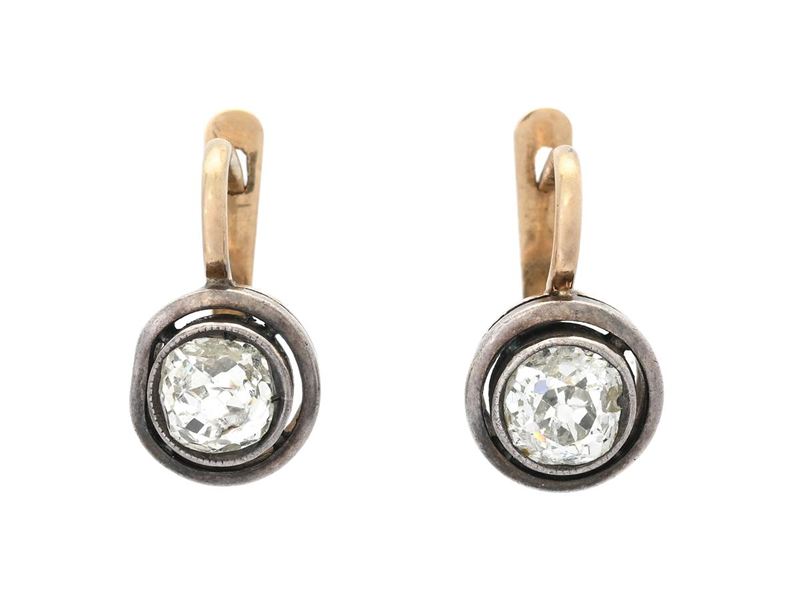SOLITAIRE EARRINGS, 14K gold/silver, antique cut diamonds approx. 1,00 ctw, approx. TCa(K)/P1, weight 2,1 g, russian clips, one of the earrings is damaged, both diamonds has damages.
