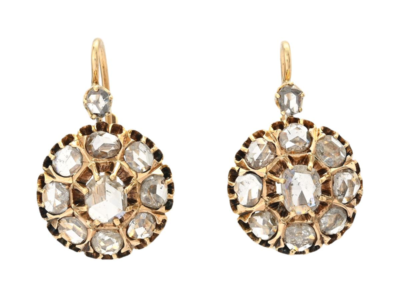 EARRINGS, 18K gold, rose cut diamonds approx. 1,00 ctw, height 22 mm, weight 5,9 g, hooks, a few diamonds with damages and notch.