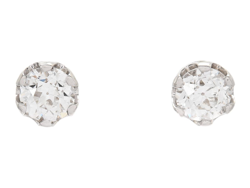 SOLITAIRE EARRINGS, 18K white gold, old European cut diamonds approx. 1,10 ctw, approx. R(E)/VS2, weight 1,6 g, pushback, one diamond has notch at the girdle.