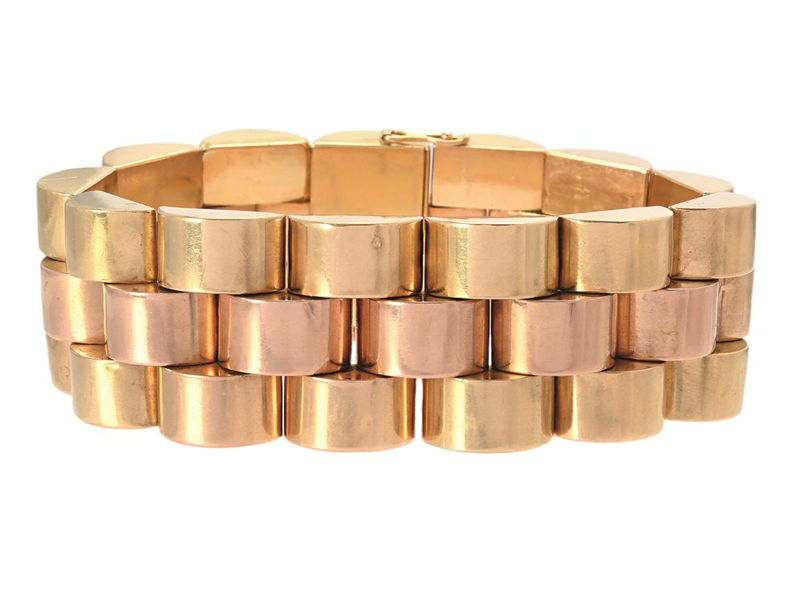 BRACELET, 18K two color gold, France 1940´s, width 24 mm, length 18,5 cm, weight 94,3 g, safety chain, small dents.