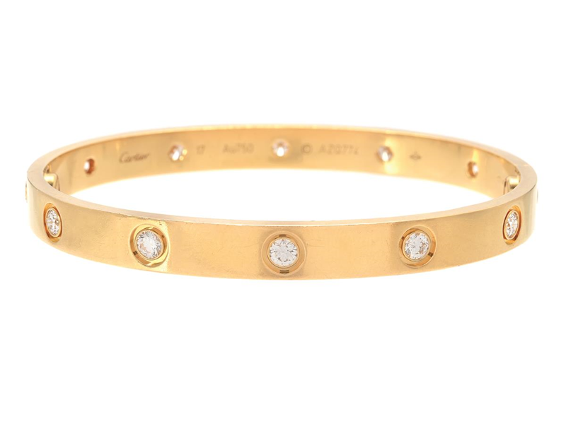 CARTIER, Love bracelet, classic model, 18K gold, 10 brilliant cut diamonds approx. 0,96 ctw, serial number AZQ774, size 17, weight 30,7 g, screwdriver, original case and paper box.