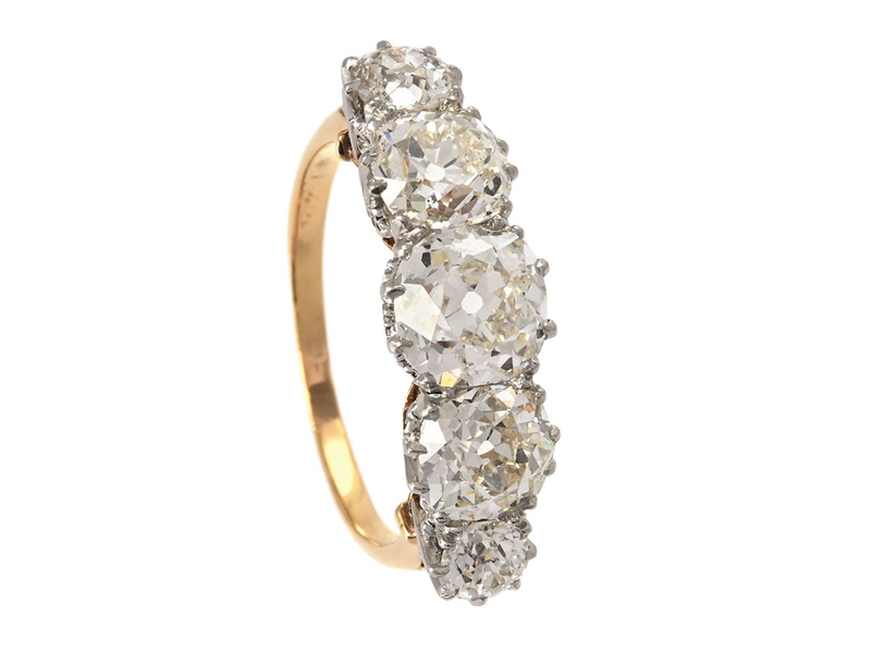 RING, 18K gold/platinum, old European cut diamonds approx. 4,00 ctw, of which center stone approx. 1,39 ct, approx. TW-TCa(G-K)/VS-P, size 18,75 mm, weight 5,3 g, a few diamonds with damages and notches at the girdle.