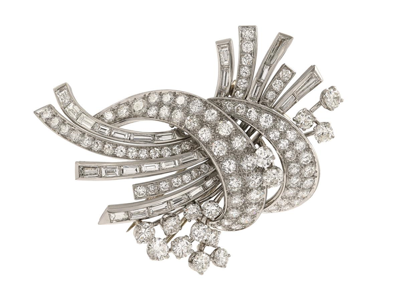 BROOCH/PENDANT, platinum, baguette-, trapeze- and brilliant cut diamonds approx. 6,50 ctw, approx. R-Cr/VS-P, French assay marks, 1950/60´s, measurements 46x43 mm, weight 22,2 g, repairs, one prong is missing, a few diamonds have notches.