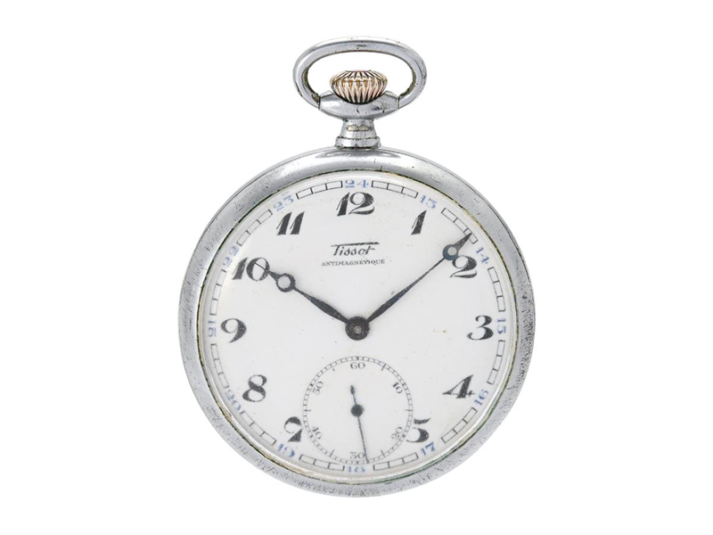 TISSOT, Antimagnetique, pocket watch, Cal. 43, Serial no. 459571, Case no. 550955, white metal, lever escapement, approx. 1940.