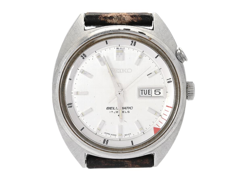 SEIKO, Bell-Matic, Cal 4006 A, Serial no. 143251, Case no. 4006-6010, men´s wristwatch, 37 mm, steel, self winding, plastic crystal, day, date, alarm (defect), leather strap, approx. 1971.