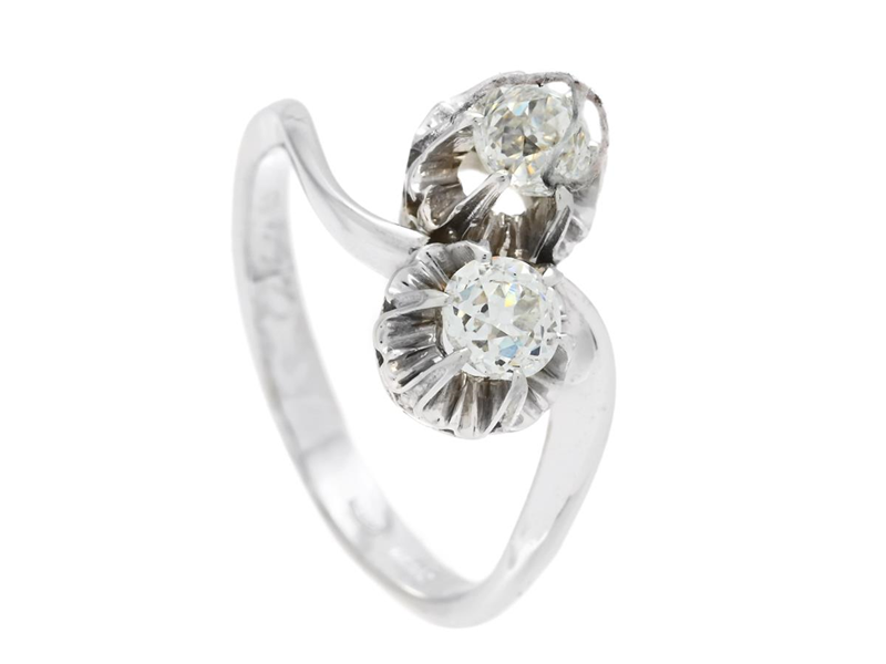 TWO STONE CROSS OVER RING, 18K white gold, 2 old European cut diamonds approx. 0,50 ctw, approx. W(H)/VS, size 16,75 mm, weight 4,0 g, rhodium plating has faded.