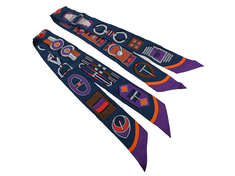 SCARF, HERMÈS, 2 Twilly, 100% silk, 84x5 cm, blue, purple, brown, red, case.