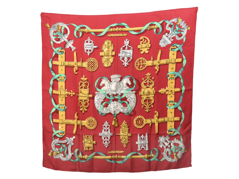 SCARF, HERMÈS, Ferronnerie, Caty Latham, 100% silk, approx. 90x90 cm, red, green, gold.