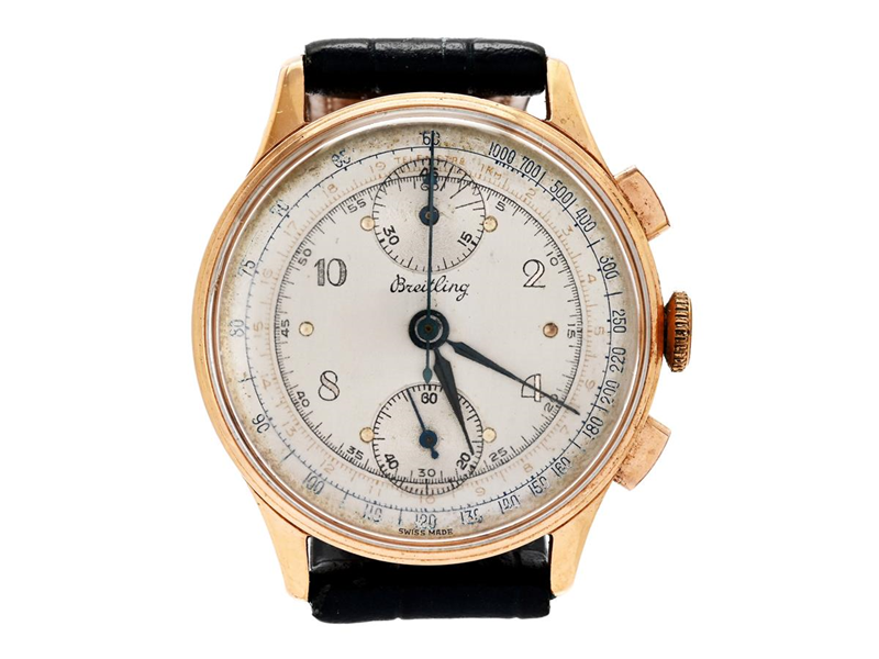 BREITLING, chronograph, "Telemetre", Cal Venus 170, Case no. 661174 / 178, men´s wristwatch, 35 mm, 18K gold, manual winding, plastic crystal, damaged dial, leather strap, approx. 1945.