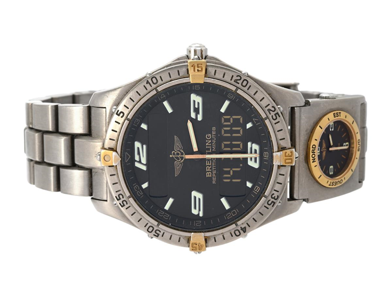 BREITLING, Aerospace, Repetition Minutes, Cal 65, Serial no. 12304, Ref no. F65062, men´s wristwatch, 40 mm, titanum/gold plated, analogue/digital, quartz, sapphire crystal, UTC, Serial no. 1302, Ref no. F61172, titanium/gold plated, Professional bracelet, folding clasp, Ref no. 1401/127 E, certificate, March, 1998, box.