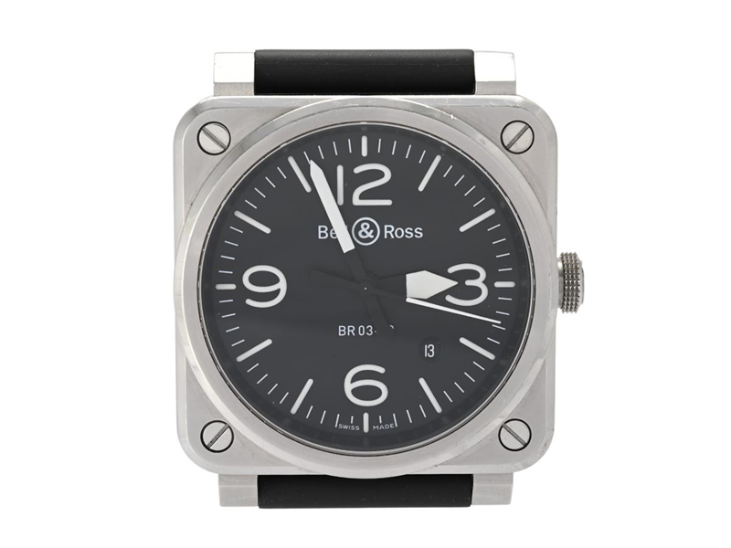 BELL & ROSS, BR 03-92, Cal 302, Serial no. 01835. Ref no. BR03-92-BLC-ST, Case no. BR03-92-S, men´s wristwatch, 42 mm, steel, self winding, sapphire crystal, date, rubber strap, original steel buckle, certificate, December 2017, box.