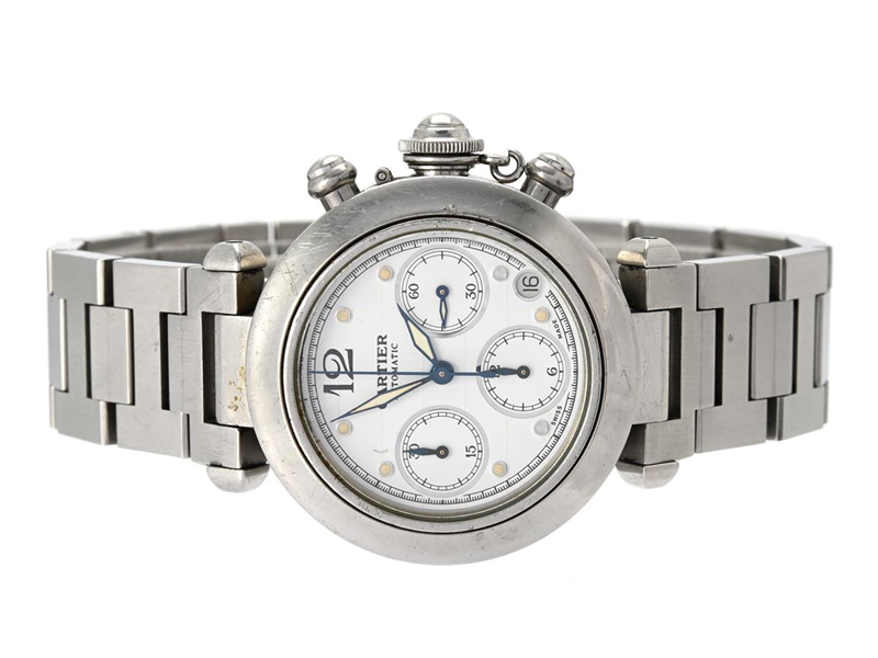 CARTIER, Pasha "C", Cal 047 (ETA 2894-2), Movement no. 122230, Case no. 2412/789208 CC, chronograph, men´s wristwatch, 36 mm, steel, self winding, sapphire crystal (repor), date, replaced hands (Luminova) damaged dial (missing lume), defect (not working, needs overhaul), ATT: defect crown protection, integrated original bracelet, folding clasp, approx. 1999, service pouch.