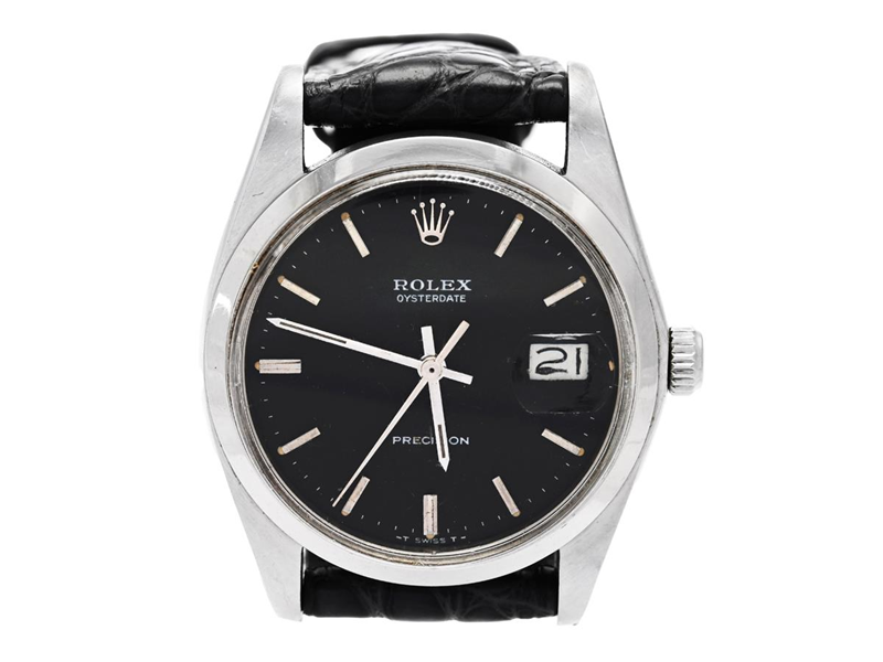 ROLEX, Oysterdate, Precision (-T Swiss T-), Ref no. 6694, Serial no. 5224561, Cal 1225, Case no. 6694, men´s wristwatch, 35 mm, steel, manual winding, plastic crystal, date, damaged dial, leather strap, approx. 1977.