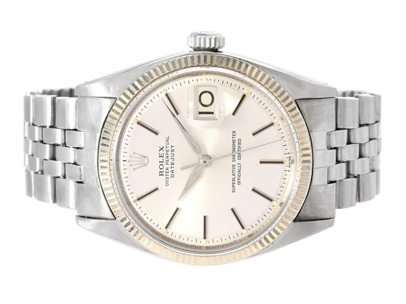 ROLEX, O, Datejust (T Swiss T), Chronometer, Ref no. 1601, Serial no. xx7852, Cal 1560, Movement no. D19309, Case no. 1601 (I.61), men´s wristwatch, 36 mm, steel/white gold, self winding, plastic crystal, date, damaged dial, damaged case (pores), Jubilee bracelet (no size alteration), folding clasp, Ref no. 6251H-2.69/55, length 160 mm, Chronometercertificate, manufactured first quarter 1961.
