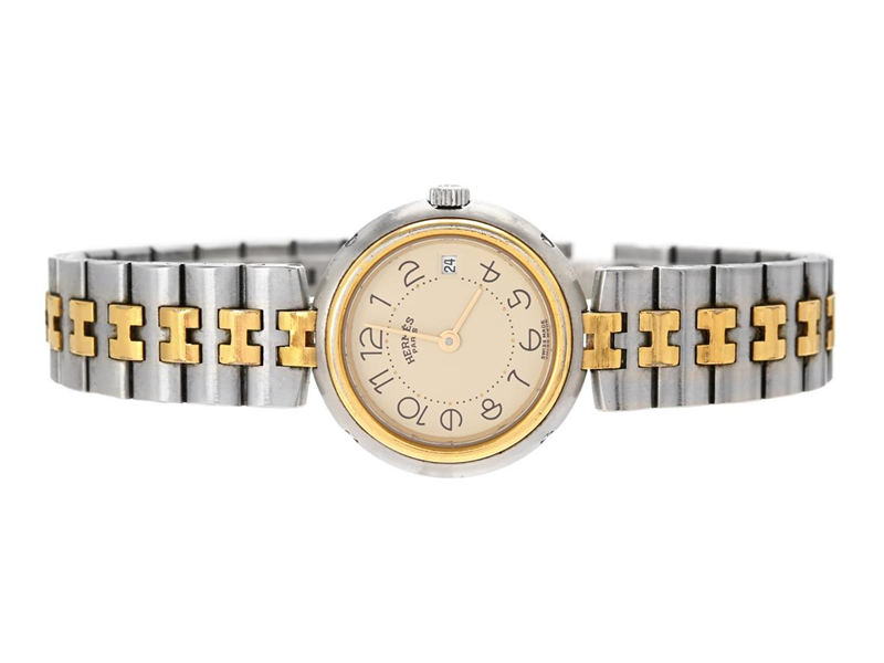 HERMÈS, Paris, ladies´ wristwatch, 25,5 mm, Serial no. 101003, Case no. 81 03, bicolour, quartz, sapphire crystal, date, damaged dial, movement not signed, integrated original bracelet, approx. 1992.