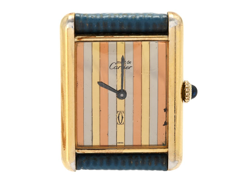 must the CARTIER, Tank, s.c. "Trinity Dial", Cal 78-1 (ETA 2512-1), Case no. 6 134929, unisex, 23,5 x 23 (31) mm, gilt silver (partly worn off), manual winding, mineral crystal, damaged dial, leather strap, approx. 1980.
