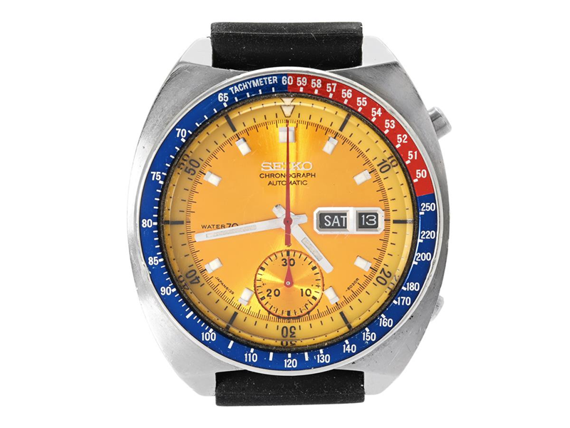 SEIKO, "Tachymeter", s.c. "Pogue", chronograph, men´s wristwatch, 41 mm, Cal 6139 B, Serial no. 232244, Case no. 6139-6002, steel, self winding, hardlex crystal, day, date, damaged dial/hands, defect (not working, needs overhaul), rubber strap, approx. 1972.