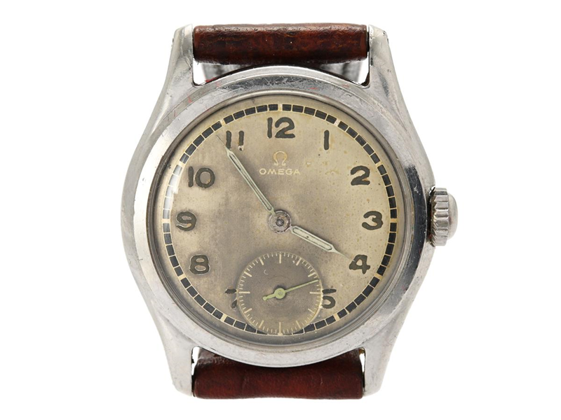 OMEGA, men´s wristwatch, 32,5 mm, Cal 26,5 T3 PC T1, Serial no. 10663660, Ref no. CK 2450, Case no. 2450 2, steel, manual winding, plastic crystal, small seconds hand, damaged dial, leather strap, approx. 1946.