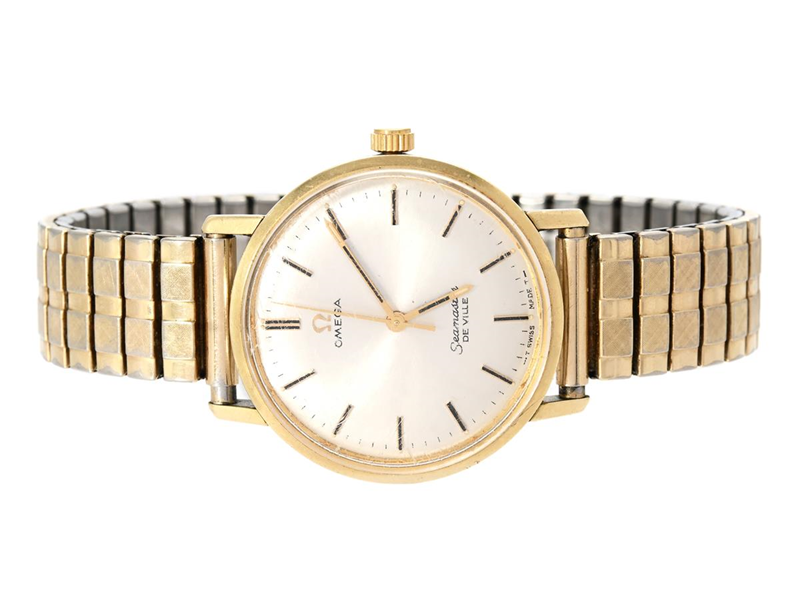 OMEGA, Seamaster, De Ville (-T Swiss Made T-), Cal 601, Serial no. 32631907, Ref no. CD 135.020, Case no. 135.020 SP (C.B), men´s wristwatch, 34 mm, gold on steel, manual winding, plastic crystal, approx. 1970, metal bracelet not original.