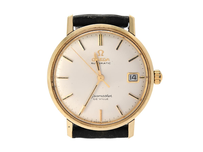 OMEGA, Seamaster, The Ville (T Swiss Made T), Cal 565, Serial no. 27591203, Ref no. CD 166.020, Case no. 166.020 SP (C.B), men´s wristwatch, 34,5 mm, gold on steel, self winding, plastic crystal, date, damaged dial, engraving, leather strap, approx. 1968.