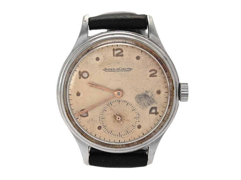 JAEGER-LE COULTRE, men´s wristwatch, 33,5 mm, Cal P469/A, Serial no. 652163, Case no. 501301, steel, manual winding, plastic crystal, small seconds hand, damaged dial, defect (needs overhaul), leather strap, approx. 1949.