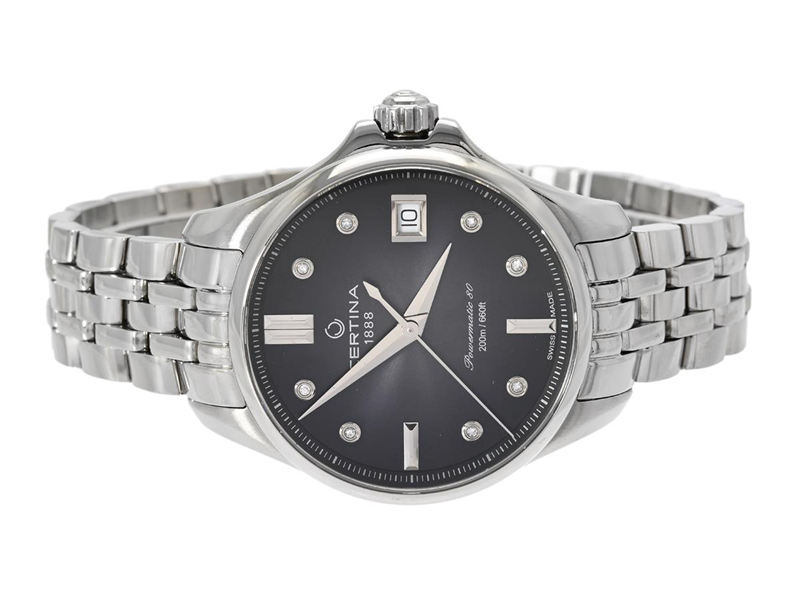CERTINA, DS Action Lady (200m/660ft), Powermatic 80, Cal 80 (ETA C07611), Serial no. LPHR45NVC, Ref no. C032.207.11.056.00, Case no. C032207A, ladies´ wristwatch, 34,5 mm, steel, self winding, sapphire crystal, date, diamonds on dial (8 pcs. 8/8), display caseback, original bracelet, folding clasp, approx. 2020.