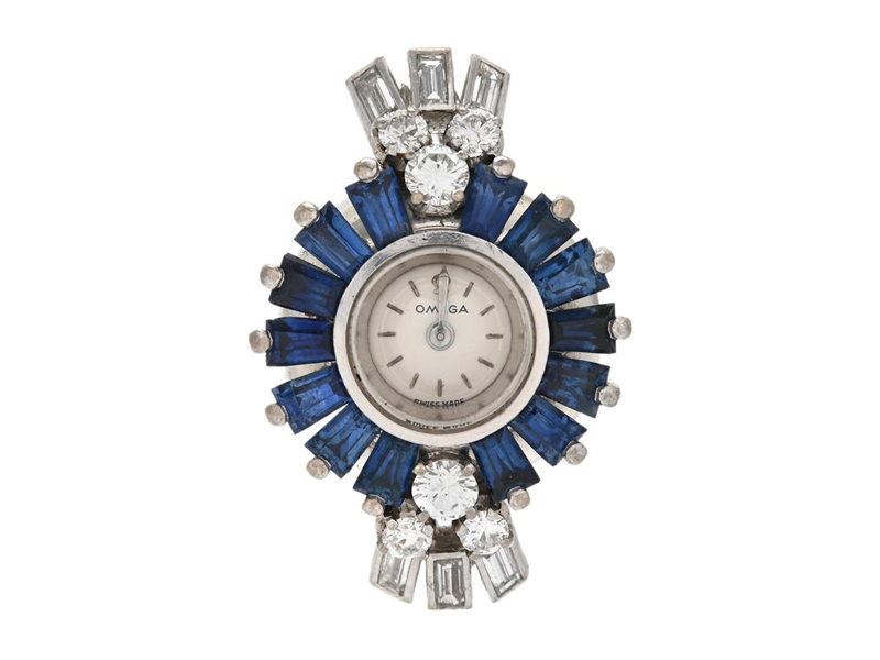 OMEGA, ladies´ wristwatch, 18 mm, Cal 440, Serial no. 14949080, Case no. 11379941, 18K white gold, manual winding, sapphire crystal (damaged), bezel with sapphires (14 pcs. trapeze cut) and briljanter/diamanter on the case (12 pcs. approx. TW/VS, approx. 0,70 ctv), defect (servicebehov), approx. 1955.