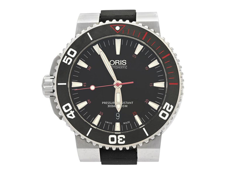 ORIS, Aquis Date, "Red", Cal 733 (SW 200-1), Serial no. 3360984, Ref no. 01 733 7653 4183, Case no. 7653-83, men´s wristwatch, mm, steel, self winding, sapphire crystal, date, display caseback, rubber strap, integrated original bracelet, folding clasp, Ref no. 07 8 26 01PEB, certificate, August 2017, box, paper box. Limited and numbered (No. 0984/2000).