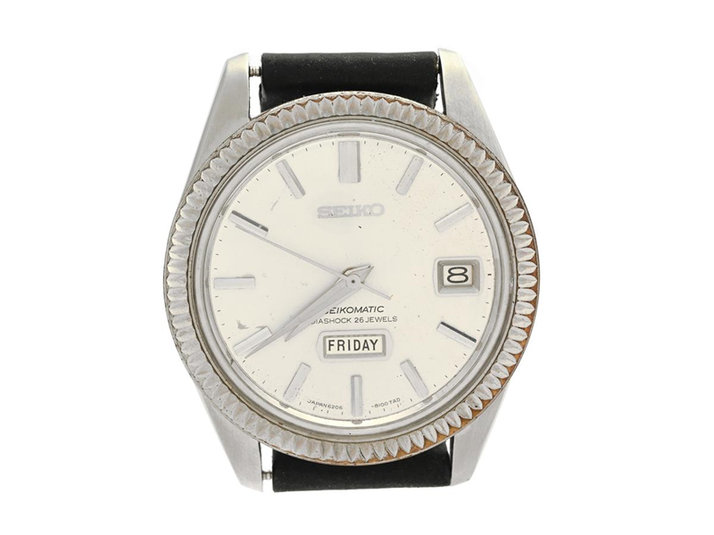 SEIKO, Seikomatic, Cal 6206B, Serial no. 5N32039, Case no. 6206-8080, men´s wristwatch, 37 mm, steel, self winding, plastic crystal, day, date, damaged dial, leather strap, approx. 1965.