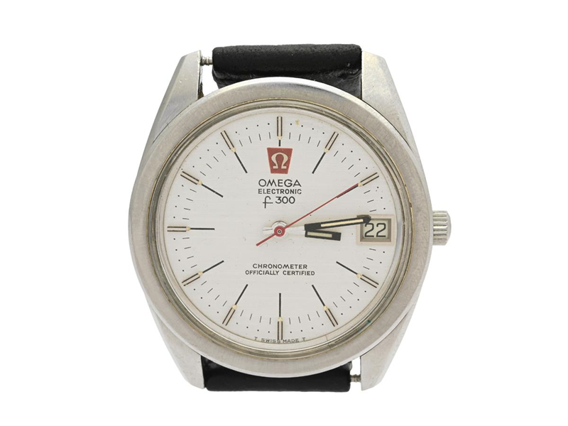 OMEGA, Seamaster, Electronic (f 300 Hz, T Swiss Made T), Chronometer, Cal 1250 (ESA 9162), Serial no. 32850827, Ref no. ST 198.001, Case no. 198.001 (C,B), men´s wristwatch, 36,5 mm, steel, tuning fork, plastic crystal, date, damaged dial, leather strap, approx. 1970.