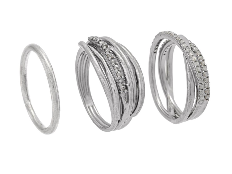 3 RINGS, silver, white stones, size 18/18,5/19 mm, weight 11,5 g.