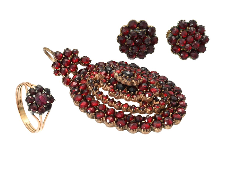 JEWELLERY SET, yellow metal/silver, garnets, pendant, ring size 16 mm, earrings with screwbacks, total weight 18,6 g.