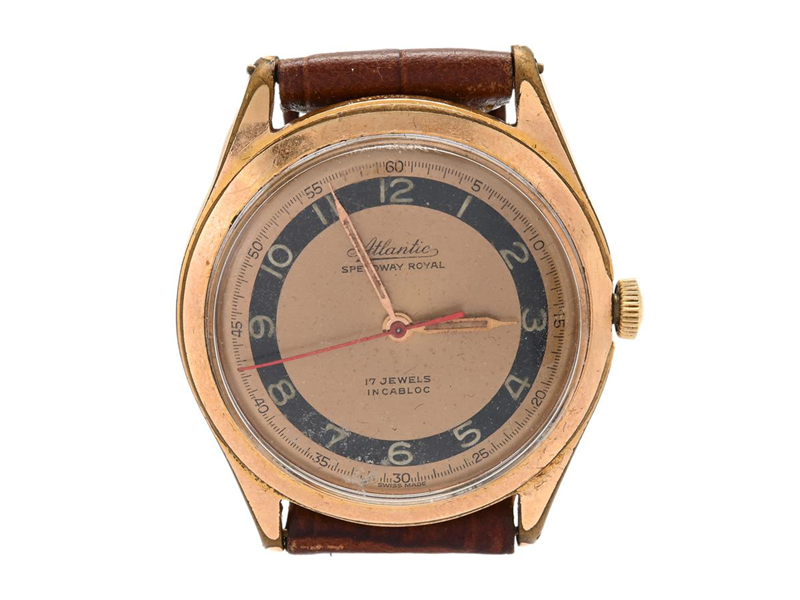 ATLANTIC, men´s wristwatch, 35 mm, Case no. 358426 / 488, gold plated (damaged, 20 micron), manual winding, plastic crystal, damaged dial, leather strap, approx. 1955.