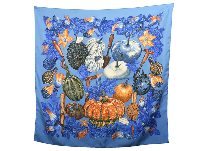 SCARF, HERMÈS, Citrouilles & Coloquintes, Valérie Dawlat-Dumoulin, 100% silk, 90x90 cm, blue, orange, green, brown, case.