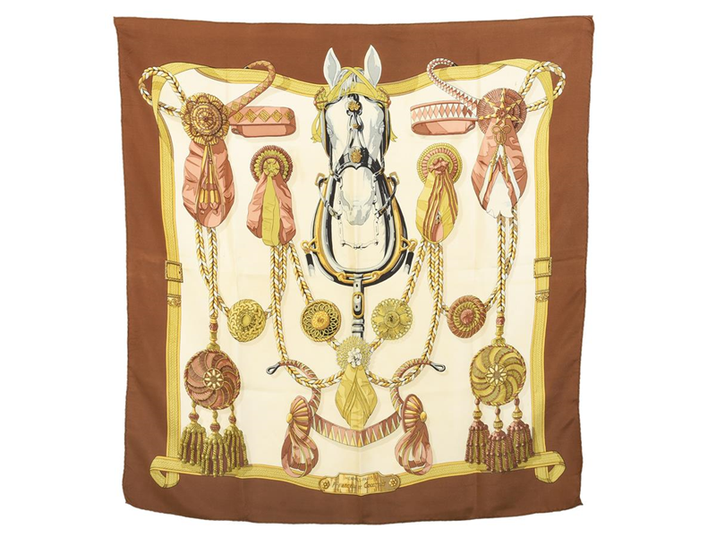 SCARF, HERMÈS, Frontaux et Cocardes, Caty Latham, 100% silk, 84x88 cm, beige, brown, yellow green, stains.