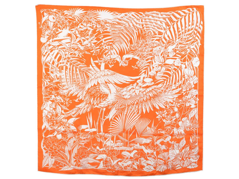 SCARF, HERMÈS, Flamingo Party, Laurence Berthoumieux, 100% silk, 88x88 cm, orange, white.