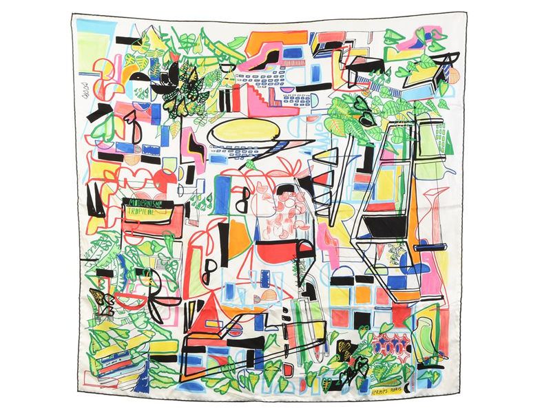 SCARF, HERMÈS, Modernisme tropical, Filipe Jardim, 100% silk, 90x88 cm, white, blue, pink, green, black, receipt copy from 2016, case.