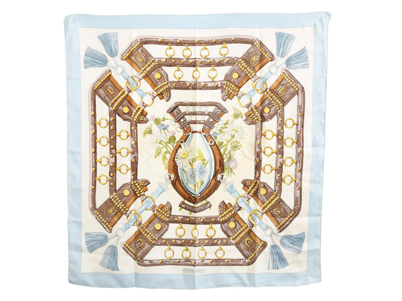 SCARF, HERMÈS, Aux Champs, Caty Latham, 100% silk, 90x88 cm, white, light blue, brown yellow, many stains.