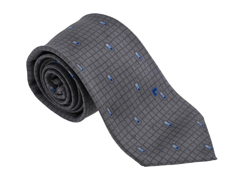 TIE, PACO RABANNE, 100% silk, grey, blue, width 8 cm, stains, one small hole, signs of wear.