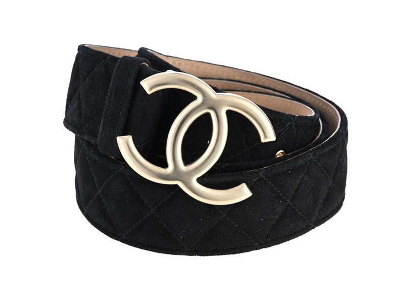 BELT, CHANEL, black quilted suede, Logo CC, gold-tone buckle, length 100 cm, width 4 cm, marked Made in Italy, dustbag. box.