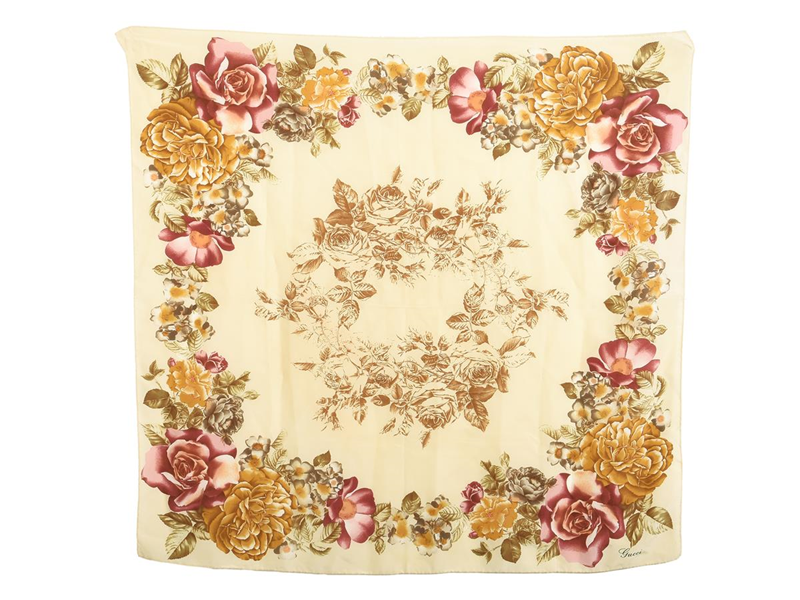 SCARF, GUCCI, 100% chiffon, beige, red, brown, green, 82x90 cm, stain.