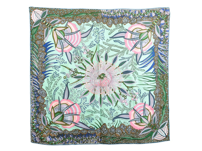 SCARF, HERMÈS, Flowers Of South Africa, Ardmore Artists, 100% silk, 90x90 cm, green, blue, pink, case.