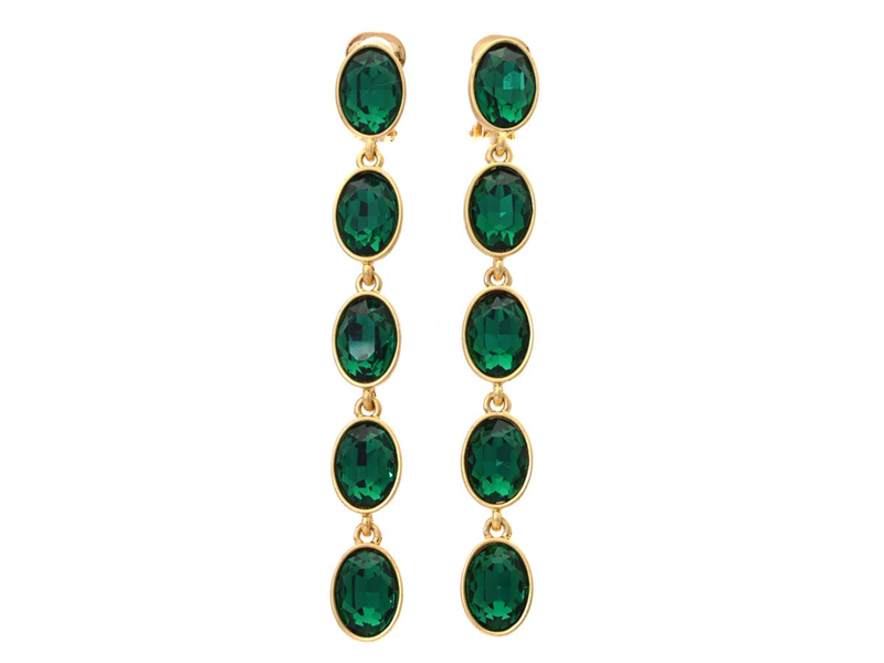 EARRINGS, OSCAR DE LA RENTA, gold-tone, green stones, clips, length 10 cm, weight 13,4 g, not original case.